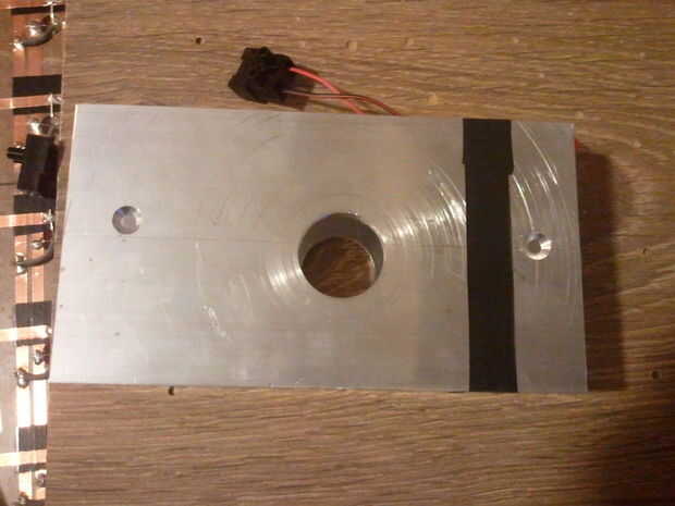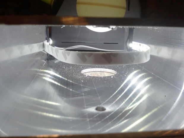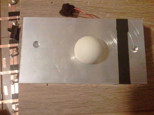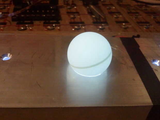 Esto es básicamente un poco de la sección de caja de aluminio con un agujero de 30mm perforado en el centro, luego una pequeña longitud de tira de LED colocadas dentro a brillar dentro. Luego simplemente uñas para el taladro con la bola en el centro (ish) y cuando usted pop en una bola y enciende el LED que se pueden ver la costura y la línea para arriba antes de lentamente hundiendo una (afiladas!) 5mm mordió a través de él.