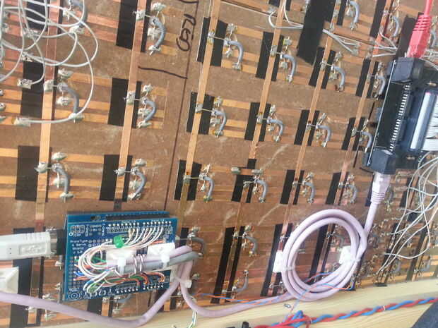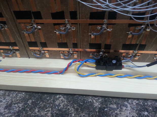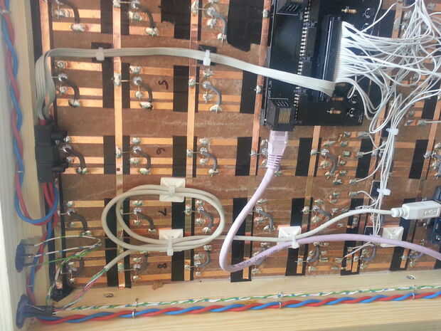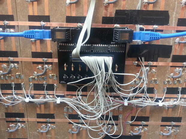 Las tablas están vinculadas con cables de remiendo CAT5, éstos llevan el cierre reloj, habilitar, claro, los datos de todos los colores a las filas superior e inferior.