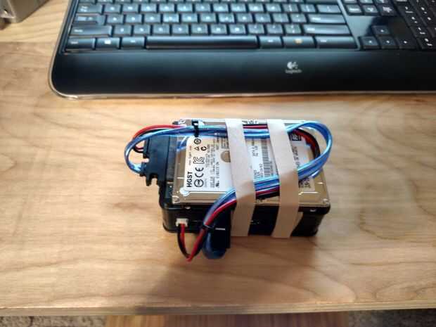 Conectar SATA y conexiones en caso banano Pi y disco duro de alimentación. Oriente la unidad y la caja a tu gusto en cuanto a electrificación y envolver 2 más bandas de goma que rodea el caso, los cables y el disco duro esta vez.