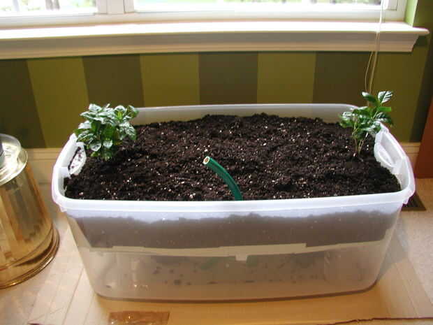 Esto es un contenedor de uno mismo-riego para el cultivo de la mayoría de las plantas. Simplemente llene el depósito con agua y se ser malvado para arriba a través de columnas llenas de suelo a las raíces de las plantas. En teoría, se debe mantener la humedad óptima en el suelo, ahorrar agua y hacer jardinería de contenedor (en el interior y hacia fuera) muy bajo mantenimiento. Yo no he hecho cualquier cosas de lujo capas fertilizante, pero supuestamente si pones una capa de fertilizante en primer lugar, antes de la suciedad, el agua hará que aparezca un flujo constante de nutrientes a las plantas y así no más fertilizantes preocupa.