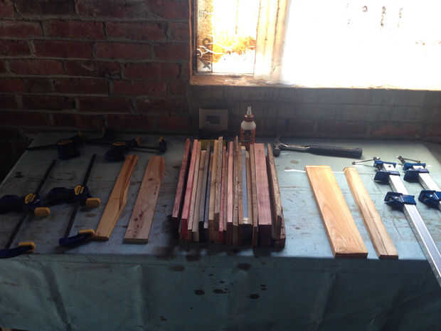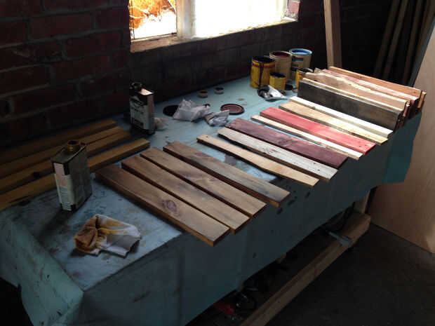 OK, ahora la parte tediosa es sobre... Has planeado, cortar y lijar todas las tablas y ahora tiene un montón de consejos de plataforma limpia y lista para usar para su mesa. Dependiendo de la apariencia que desea alcanzar, el cielo es el límite a su diseño. Si desea dejar su mesa con una mirada de madera natural , agregue en un poco teñido de piezas de acento o ir con un enfoque de varios colores más, usted necesitará averiguar primero el orden en que se establece en las tablas. Tenga en cuenta que aunque 5 de los 6 lados de cada una de sus tablas son terminadas y limpias, la parte inferior de cada uno está todavía cruda. Esto debe influir en cómo determinar armar tu tabla. ¿Quieres una variedad aparentemente aleatoria de piezas altas y cortas, o ¿quieres a una especie de gradiente de corto a la altura? También, como se verá en la fase de montaje, necesitarás dos piezas que se sentará en la misma fuera de sus marcos de pierna. Elegir un par de interesantes piezas específicamente para este papel. Una vez que han alineados sus tablas en el orden que se desee, es tiempo para la coloración.