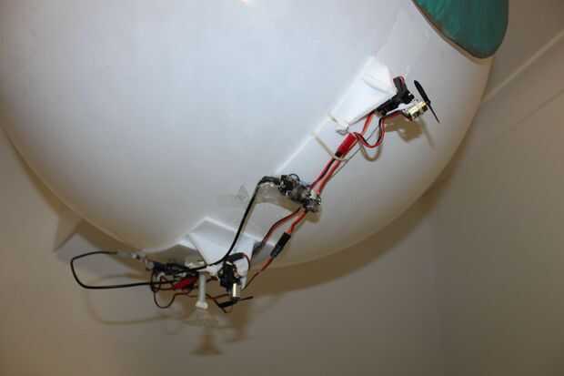 Un soporte de Depron se pega con pegamento caliente de baja temperatura. La base es curva de ajuste aproximadamente una esfera de 80cm de diámetro haciendo rodar un objeto redondo duro sobre él, con la hoja de la espuma sobre un cojín (véase mi Ible original). También sostiene la cámara, pegada con algún alambre de metal (según lo utilizado en el empaquetado) que se puede doblar la cámara el punto que quieras.