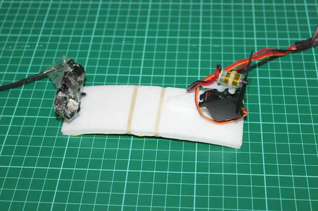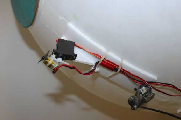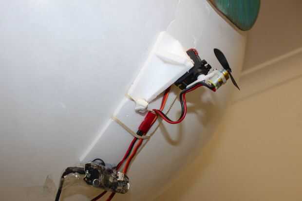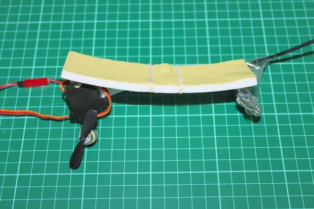 El motor se monta en el cuerno del servo del otro servo micro de alto voltaje (por una vez metemos). Un cintillo y un tornillo le permiten orientarse hacia arriba (como se explica en el paso anterior. Yo no he puesto el servo completo en un ángulo, porque de esa manera cambiaría el ángulo del motor al girar.