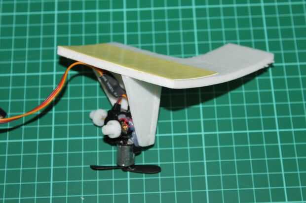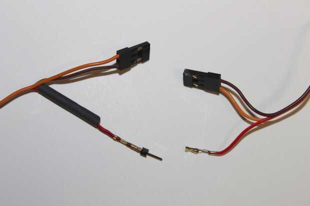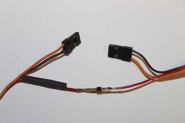 Prueba esto en 7,4 V demostró el motor calentando cuando se utiliza durante mucho tiempo. La propulsión de arriba-abajo se utiliza cerca continuamente, esto me preocupó. Pude ha actualizado el motor, pero después la electrónica no podría llevar a cabo en tensión. Y todos los servos de alto voltaje que pude encontrar son los tipos digitales, que no es interesante en este caso, como la respuesta digital no significa control proporcional de la velocidad de la hélice. Sin embargo la ESC de la propulsión hacia adelante tiene un BEC da 5V, es que los servos hackeados se diseñan para. Para no sobrecargar este BEC, sólo la propulsión de arriba-abajo es alimentada por él. Así el + cables de ambos el ESC conector a la unidad del receptor y el servo hackeado no conectados a la unidad de WiRC (funcionando totalmente con 7, 4V) y sacados los conectores y conectados entre sí con un pin de cabecera sola de doble longitud. Evidentemente esta conexión está cubierta para aislar eléctricamente del resto.
