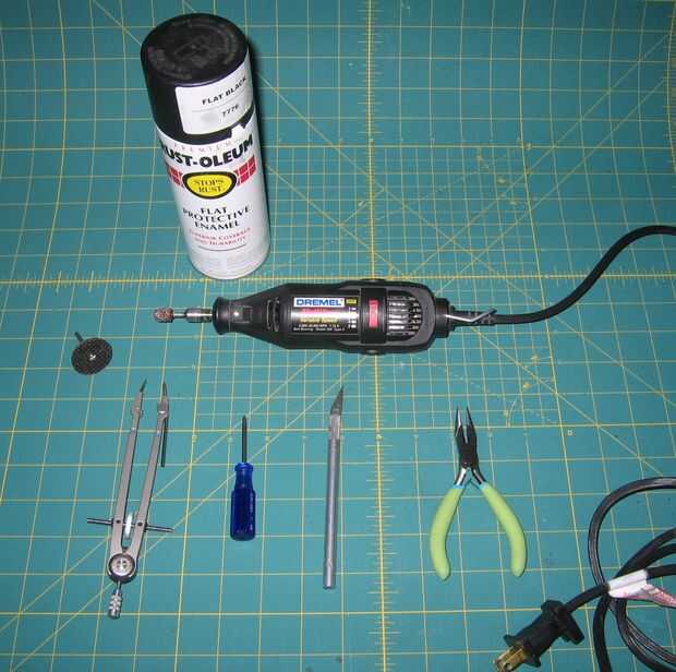 2. una herramienta giratoria, como la Dremel, con una herramienta de corte, pedacito de taladro pequeño y amoladora. (práctico, pero no obligatorio)