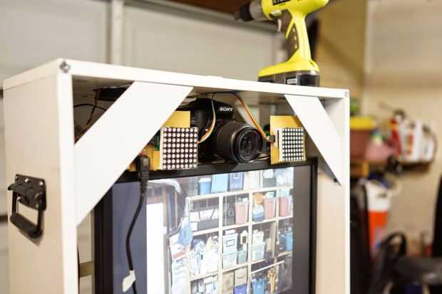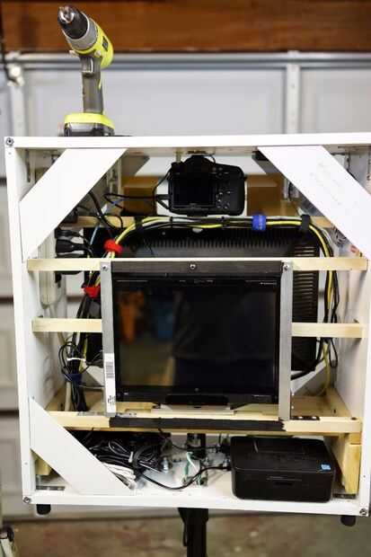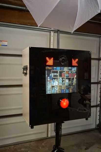 Hay una réflex digital conectada vía HDMI a un monitor de la computadora en la parte delantera de él. El usuario puede golpear el botón rojo grande que está conectado a un microcontrolador Arduino que programé, que luego se activará la réflex digital y flash (detrás del paraguas) para tomar la foto. Usar un flash speedlight que tiene una batería de iones de litio para que pueda tomar más de 1000 tiros antes de que salga el jugo.