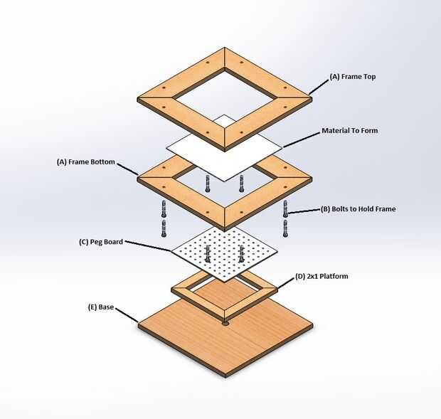Una placa base tendría un agujero para una manguera de vacío hogar. Sería construido en el centro de esa medida 11 x 11 en un pequeño marco. Pegado a la base y luego posterior sellado con masilla. Una sección cuadrada de pegboard pegada a la parte superior de ese marco y la ley como la cama de la primera vacío. Por separado, dos marcos de MDF sándwich el material para ser vacío formado y los celebrará junto con los pernos. Funcionamiento algún tipo de cinta de goma alrededor del perímetro del marco para formar un sellado al vacío. Este marco con el material en el iría en el horno para calentar el plástico y se colocan sobre la cama para formar la parte.