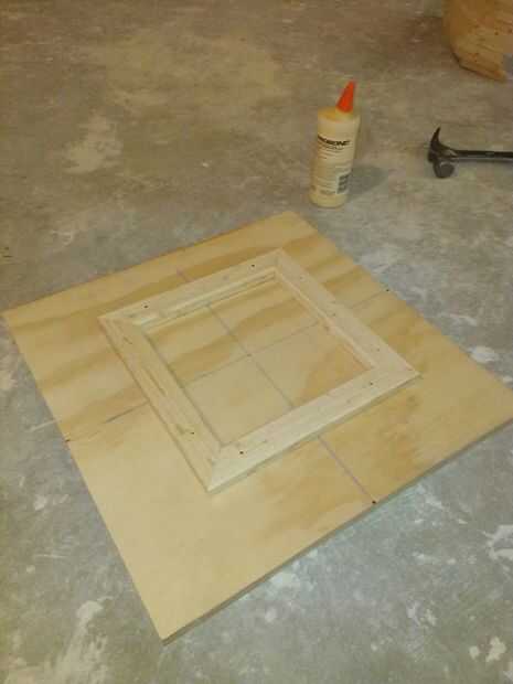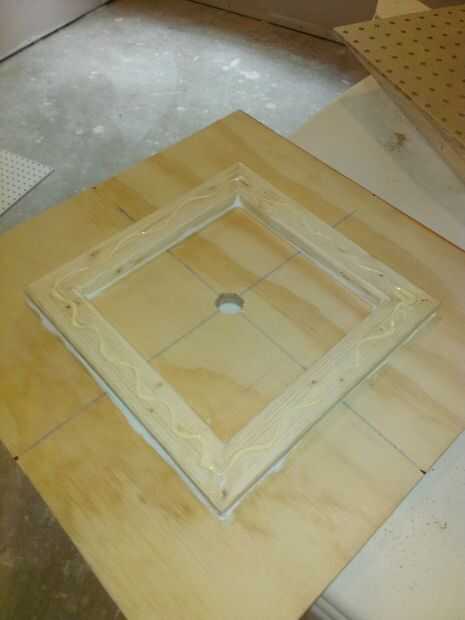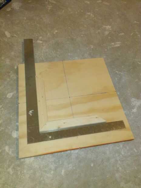 Usé una gran plaza con marcas de pulgadas en ayuda tanto centro el marco y el Asegúrese de que es cuadrado. Una vez que esté satisfecho con la colocación, pegar las piezas del marco de 2 x 1 en el lugar y permitir que el pegamento se seque. Mientras se seca se puede perforar el agujero central. Ya que estaba usando tubería de PVC, que encontré un agujero vio de ese tamaño y utilizado para cortar el agujero. En este punto para calafatear puede aplicarse para llenar los vacíos que puedan causar fugas de aire.