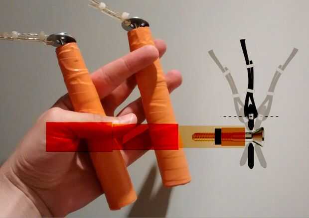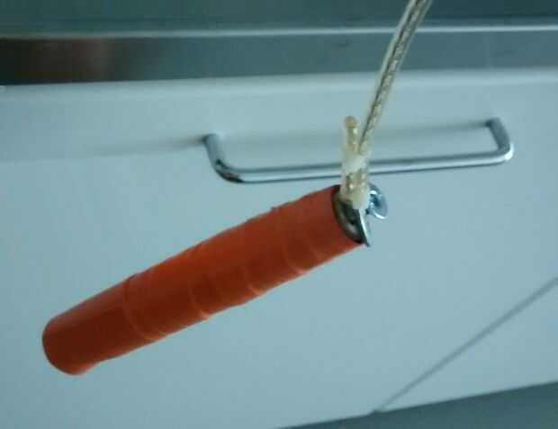 Usted puede seguir esta larga explicación en el bosquejo insertado en la imagen de arriba. El componente activo giratorio está hecho de un Tornillo avellanado, una lavadora, un trozo de espiga y tuerca apropiada. El cable pasa a través de un agujero de 3mm en la lavadora y se cubrió a sí mismo con dos zipties. Realmente se ve mejor sin tubo del encogimiento o cinta para ocultar las zipties (que en mi otra cuerda). La Asamblea de cable-lavadora todo gira alrededor del eje del perno, mientras que la porción de avellanado permite que a un cierto grado de inclinación y así seguir la cuerda de una manera más libre que la cuerdas básicas del cable a través de la manija.