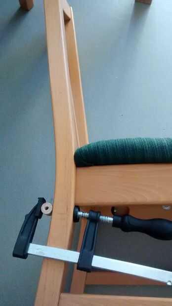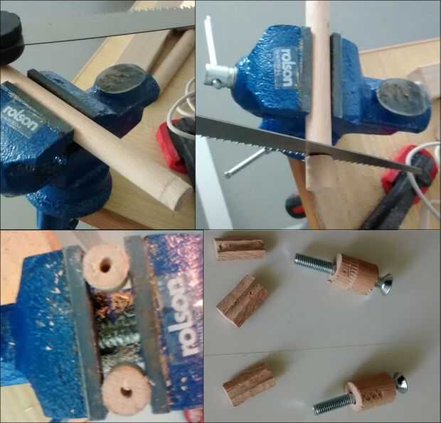 Estoy usando un tornillo de banco para cortar la espiga a la longitud deseada pero otras soluciones son posibles en caso de no tener un vicio, por ejemplo usando una abrazadera de F y una silla, como lo ejemplifica la imagen de arriba. Asegúrese de no apretar demasiado como terminaras, como yo, con un cuello rajado. El agujero debe ser un 6mm como el perno. Mis pedacitos de taladro de madera fueron prestados a un amigo por lo que terminé haciendo un trabajo extra para agrandar el agujero que hice con la broca de metal que también se usa para perforar el agujero en las arandelas.