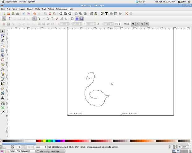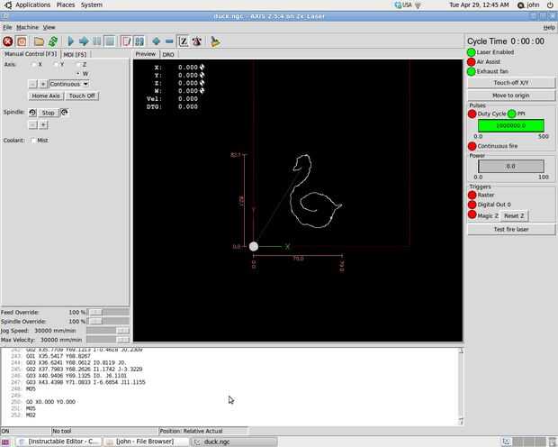 Las imágenes muestran cómo algunos dibujos (un pato, un corazón y una cuadrícula para grabar a la cama de la máquina para la colocación más exacta) pueden ser abiertos por programa LinuxCNC. Cuenta que incluso el pato 250 líneas de gCode. Repensar sobre ese demo de línea Mach3 50...