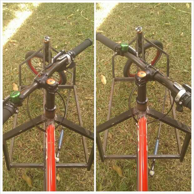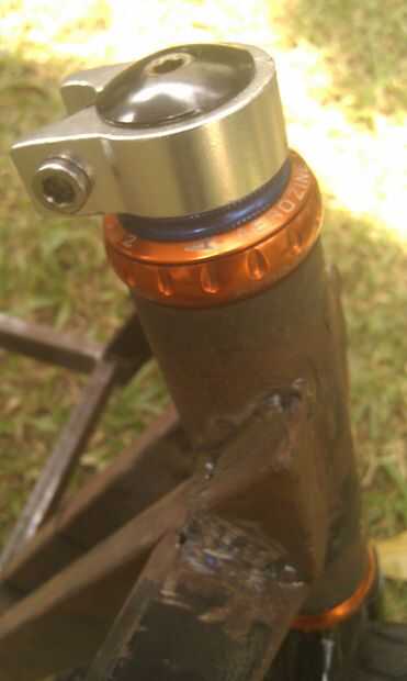Sistema de Threadless auricular necesita la madre para evitar que el rodamiento quede holgado. En esta foto usé un viejo seatclamp para reemplazar el vástago de la horquilla/horquilla delantera. Puede usar algo limpio como esta parte de solucionadores de problemas.