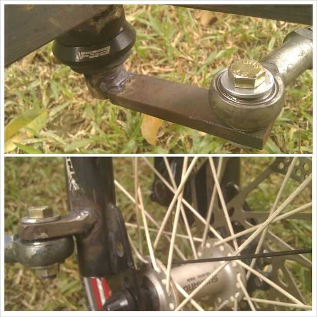 Sólo utilicé una varilla de dirección en el driveside por la horquilla no driveside fue ocupada por la pinza de freno de disco. Más información sobre el montaje de freno personalizados más adelante. Puede tener algún tipo de sistema de ajuste en la barra de dirección porque ayuda mucho durante el ajuste del manejo.