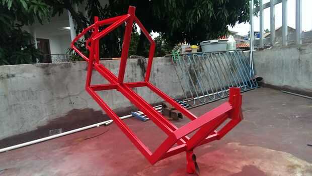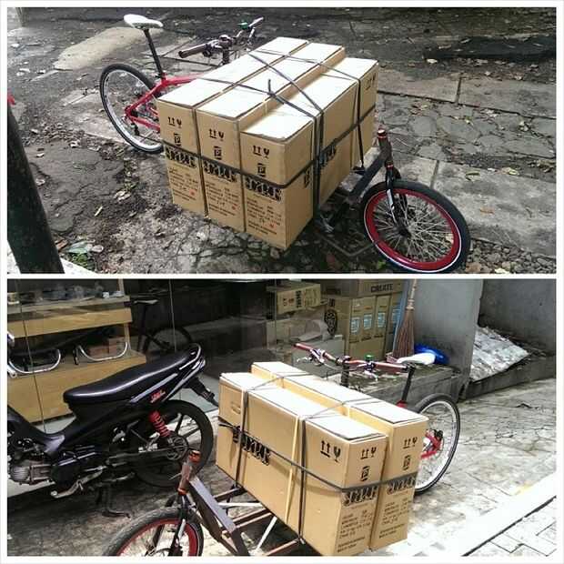 El marco pesa 12 kilogramos. Para el marco. Creo que la moto entera pesa unos 25-30 kilos... así que no hacer caja de madera para él. Terminé usando caja de envase de plástico de 100 litros cuando necesite llevar materias como comestibles o cualquier otra cosa, atado a la cama de madera con tubos de neumáticos usados.