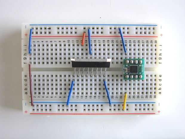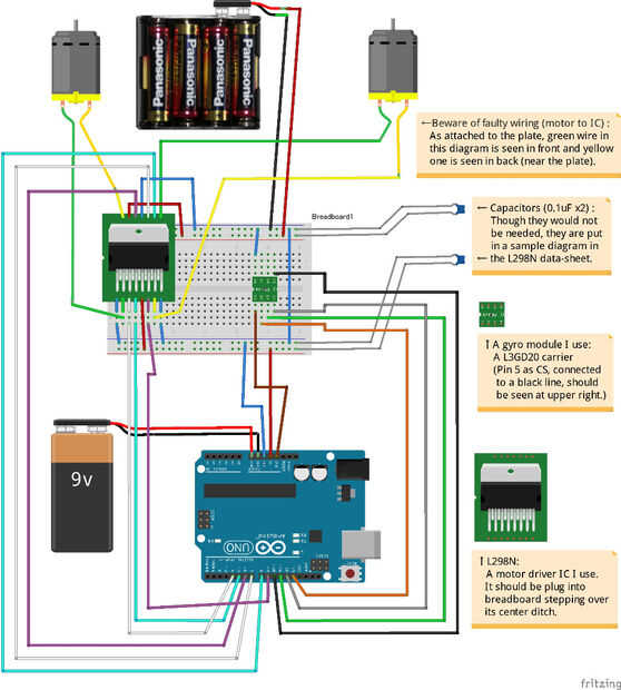 - Refiriéndose a la foto de la protoboard , conecte un módulo de giro y motor controlador IC en su protoboard