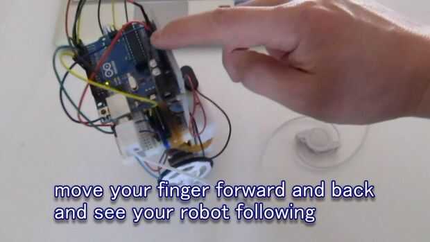 Por otro lado, si el robot no sigue el dedo a pesar de las ruedas a partir de spinning en la línea 3, tres tipos de cableado defectuoso se deben sospechar: (1) cables de un motor se fijan enfrente, (2) giro módulo se encuentra invertida, (3) cables a los pines digitales del Arduino es incorrecto. Regrese a paso 4 y verificar cableado cuidadosamente.