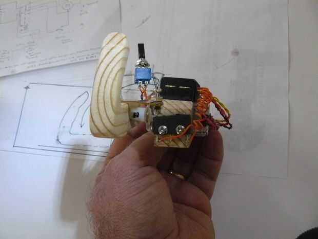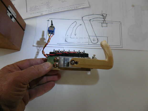 4. una vez que pensé que tenía el diseño y dimensionamiento de derecho I cortar la palanca en forma de dedo y redujo, arena a la forma, a mi concepto de dibujo. Tuve que mirar y mi motor y averiguar cómo montarlo. Servos tienen un tornillo a través del centro del eje de salida y una gran variedad de armaduras para elegir - ver las fotos para ver cómo asegura mi dedo o la palanca de mi motor.