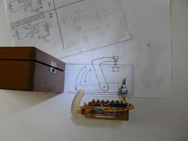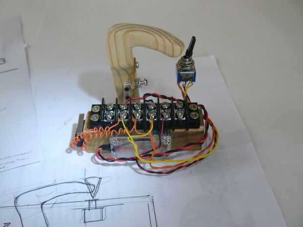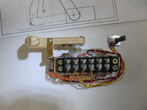 5. en este punto que decidí probar y poner todos los componentes en una unidad modular, que debería encajar en el cuadro que elegí, o cualquier otra caja, ya que es (casi) todo en una sola pieza! Esta decisión podría haber llegado después de determinar que necesitaba para levantar la parte inferior de mi motor de la parte inferior de la caja por cerca de 3/16 de pulgada. Así que pensé que usaría una tira de madera. Pero el motor (en el caso de un servo) soportes para arriba en la parte superior. Así que en vez de hacer varios bloques pequeños que necesitan ser atornillados o pegados juntos, sólo a cortar una pieza que satisfaga todas las necesidades: Mantenga el motor a la base de la caja a la altura correcta y sostener la regleta en la parte superior que ayuda a condensa todo el cableado (bueno, no necesariamente...) y sostenga el interruptor micro en un extremo. El interruptor de montaje superior flota apenas un poco allí por sus propios cables. (Totalmente no funcione en esta condición - la palanca de dedos sólo empuja el interruptor fuera del camino, y... un poco caídas y quemaduras).