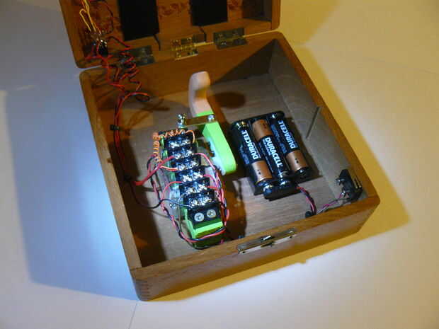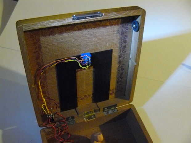 7. recomiendo cortar la escotilla en la tapa antes de taladrar el agujero para el interruptor. Si necesita hacer ajustes puede colocar el agujero un poco en cualquier dirección para asegurar que la palanca lo contactará en apenas el punto derecho. O perforar y montar el interruptor superior y entonces planear el montaje del motor para ser un poco ajustable, utilizando tornillos de madera poner en a través de la parte inferior. Cortar una pequeña escotilla de mi superior de la caja en lugar de tener la tapa semiabierta como algunos MUMEs. Mi diseño requiere que añadir una bisagra para esa pieza media, sólo caería hacia fuera porque las dos bisagras originales estaban fuera de la escotilla de la corte.