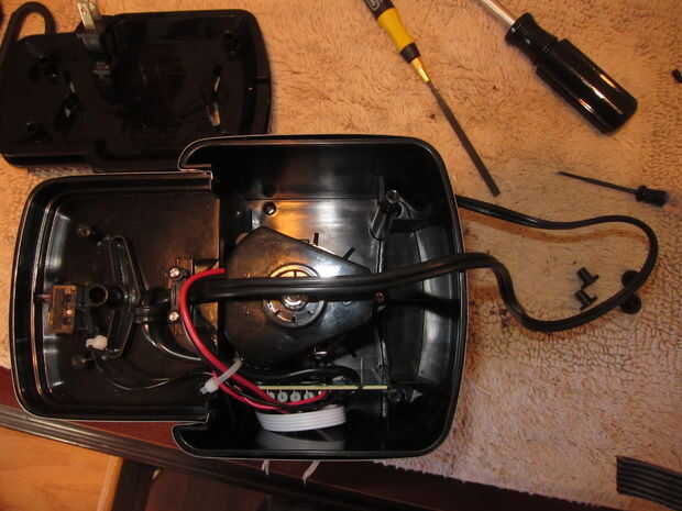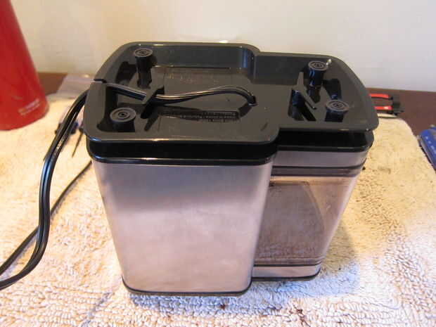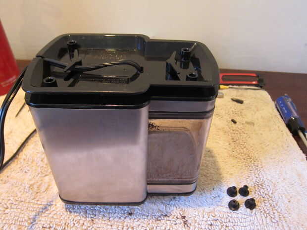 Para abrir la máquina, el primer paso es voltear la amoladora y desatornille los cuatro tornillos en la parte inferior de la máquina. Éstos están ocultos por las cuatro patas de goma en cada esquina. Retire cada pie de goma, luego use un destornillador phillips para aflojar cada tornillo. Quitar la parte inferior, teniendo cuidado del cable de alimentación. La tercera imagen es la máquina volteada boca abajo con la cubierta inferior quitada. Verás algunos electrónica en la parte inferior de la imagen, y el motor del molino está en el centro de la máquina. No tiene que lidiar con uno de estos.