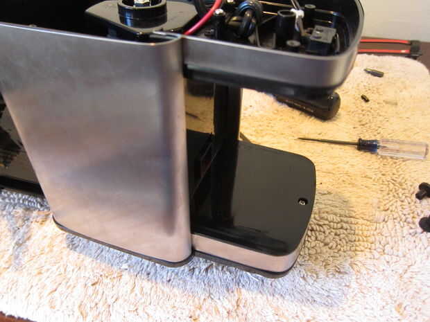 a continuación, tenemos que quitar la tapa de la máquina. Para ello, desatornillando los cuatro tornillos en las esquinas de la parte inferior de la máquina ahora volcada. Usted necesitará un largo destornillador phillips para quitar a estos. También hay un tornillo por encima de la cámara de trituración (ver segunda foto). Al quitar la tapa, tenga cuidado de la electrónica ya que restringen el movimiento de la cubierta superior.