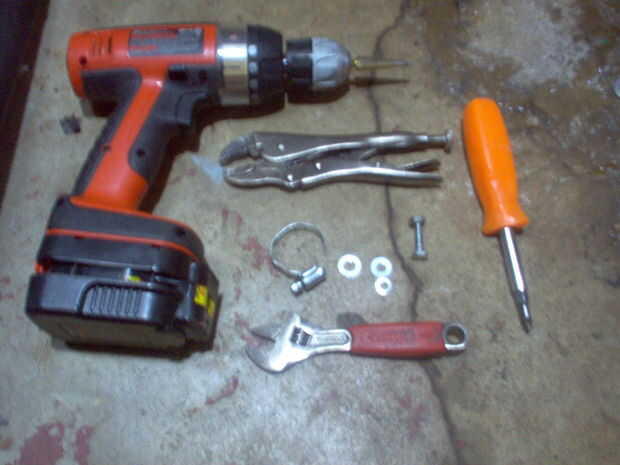 primero hay algunas cosas que usted necesita. Estas son todas las cosas que están acquireable alrededor de la casa, o en la ferretería local para barato. se necesita una manguera abrazadera (Asegúrese de que es bastante gruesa hacia los lados), broca de un perno de 1/4 de pulgada y dos tuercas, arandelas, llaves, un destornillador, taladro y 1/4 pulg.