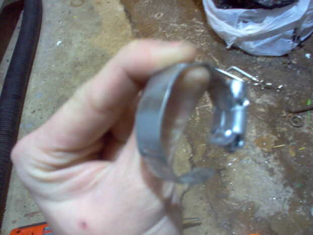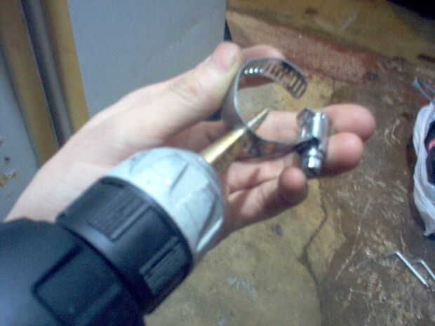 empezar por conseguir la abrazadera de la manguera y aplanar hacia fuera. una vez que haces eso, Mida hacia abajo aproximadamente 1 pulgada de la parte superior de donde el tornillo es en el que se utiliza para apretar la abrazadera de la manguera. hacer una marca justo en el centro de donde es la marca de una pulgada. Cuando eso se hace, perfore un agujero en él con el taladro y broca. Cuando el agujero se hace, asegúrese de que el agujero esté limpia y canteados. ahora en la Asamblea.