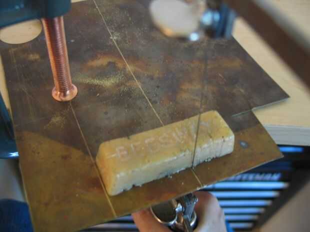 Utilizando un c-clamp, abrazadera de metal para una superficie de trabajo y luego Sierra de mano de la joyería para cortar a lo largo de las líneas del gramil.