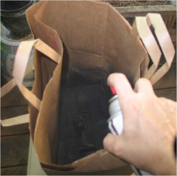 Poner todo dentro de una bolsa de papel y la explosión con pintura en aerosol. La bolsa de papel es buena para contener el exceso de rociado. Esta buena sobre todo cuando vives en un apartamento pequeño.