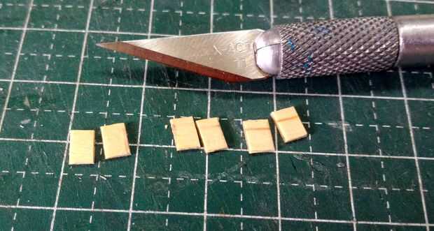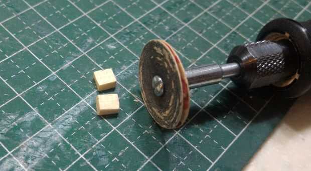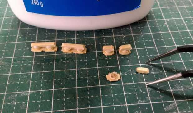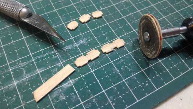 Comencé con la fabricación de los cojines del aterrizaje del palitos bajalengua-tamaño de chatarra. Las imágenes muestran que el 3 tres de las pastillas fueron en forma de cruces amplia rectangulares y las pastillas traseras 2 dos cruces rectangulares Unidas entre sí. Utilicé una lijadora de disco fineza para corte muescas en los extremos de cada pieza rectangular.