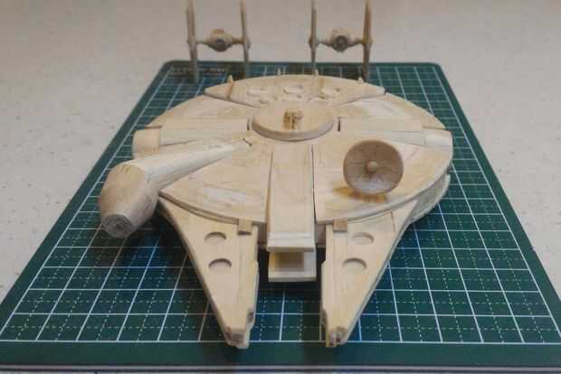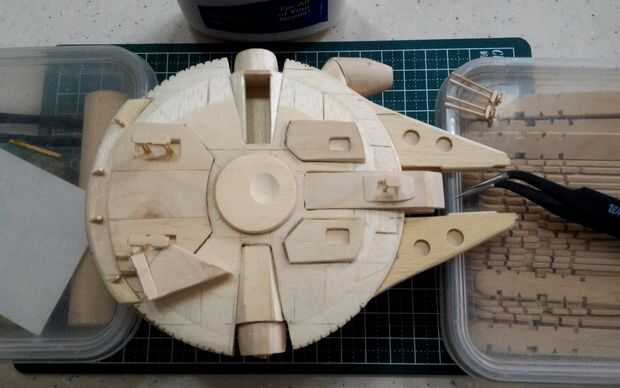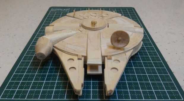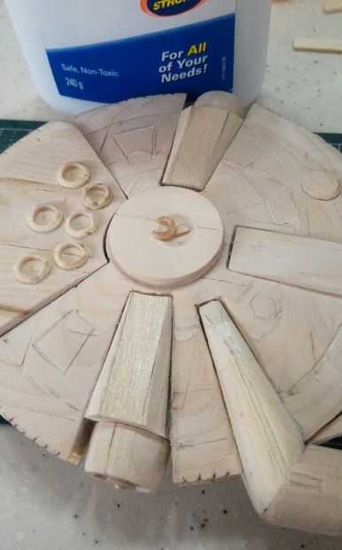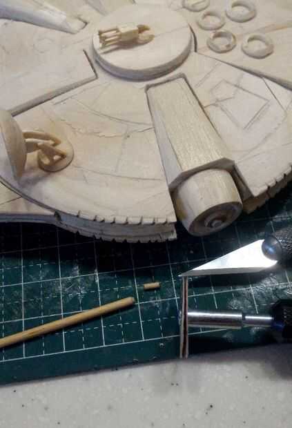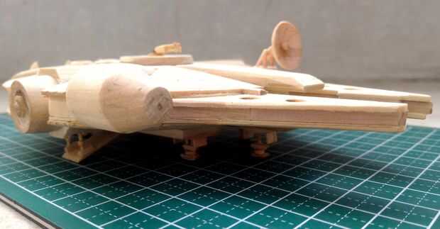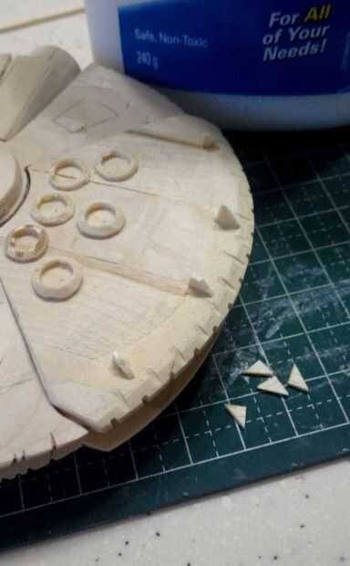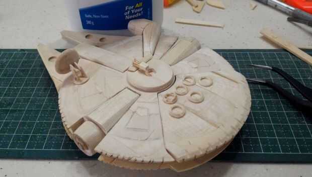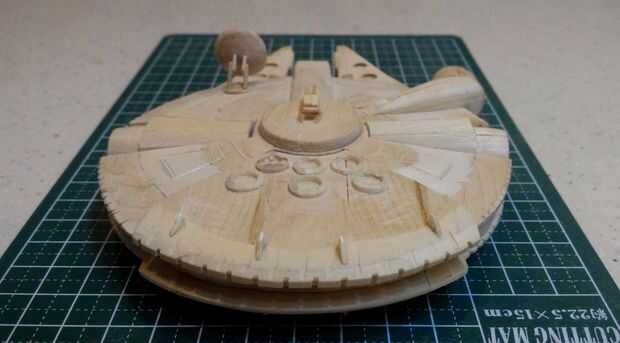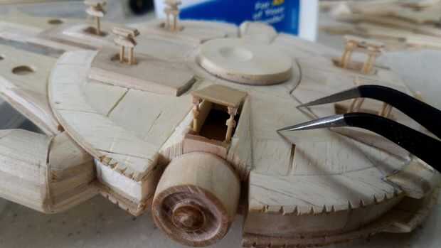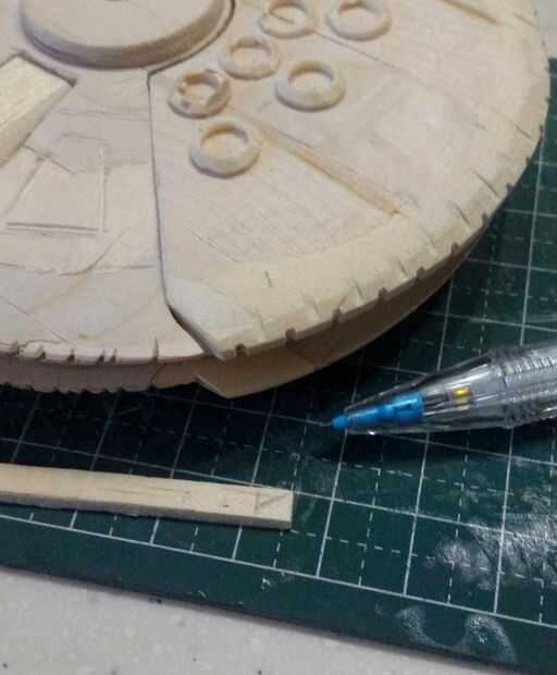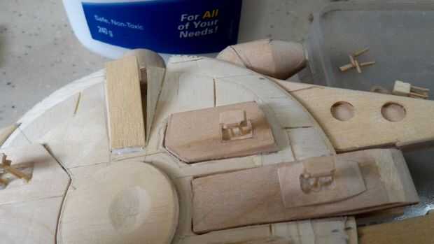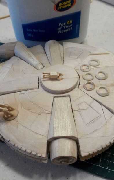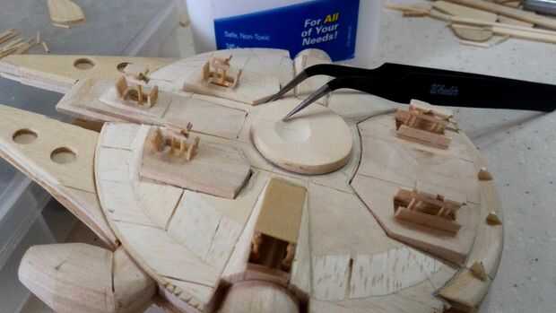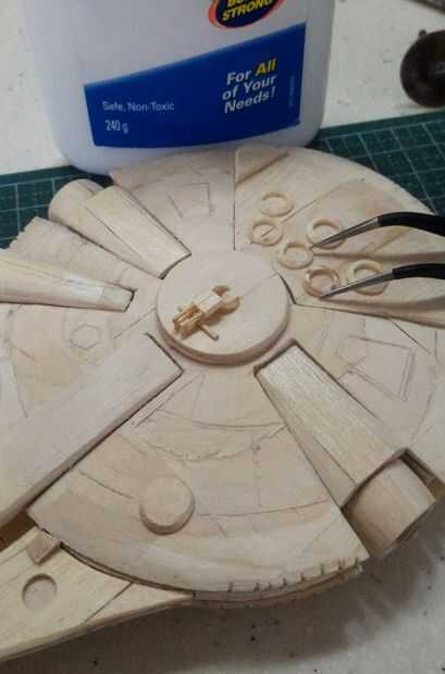 El conjunto de plato de radar luego fue pegado en la parte delantera, lado izquierdo del casco superior con la antena parabólica hacia la parte delantera del halcón.