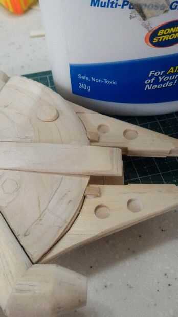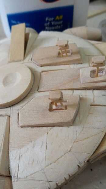 Estabilizadores de la unidad de combustible pequeño y triangular (cuatro para el casco superior) y cuatro para la parte inferior se corta de palitos de repuesto y pegados a intervalos regulares en el borde superior e inferior del sistema de impulsión de propulsión principal del vehículo.
