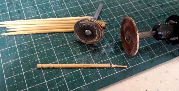 Los puntales de carga cilíndrica de dos (2) eran de palillos de madera cortado y formado con un carburo de silicio #85602 pulido de piedra y un accesorio fino lijadora de disco.