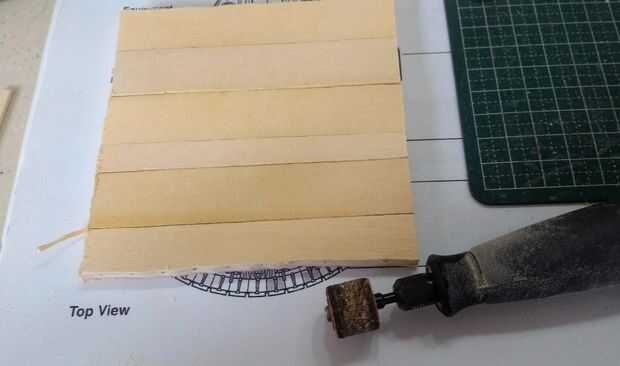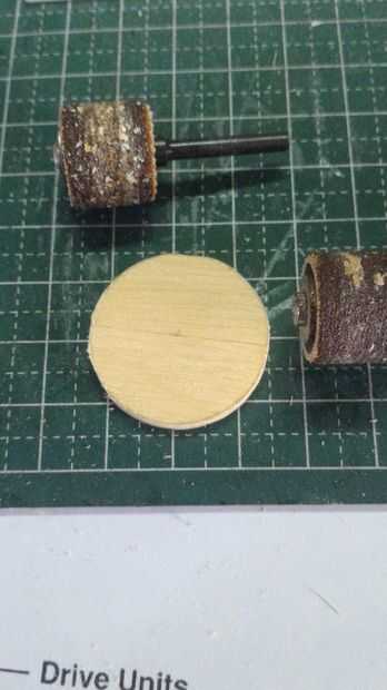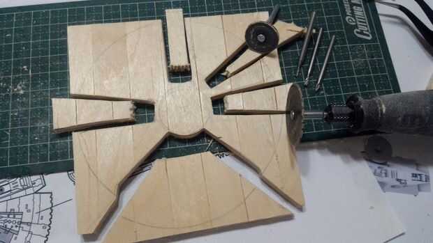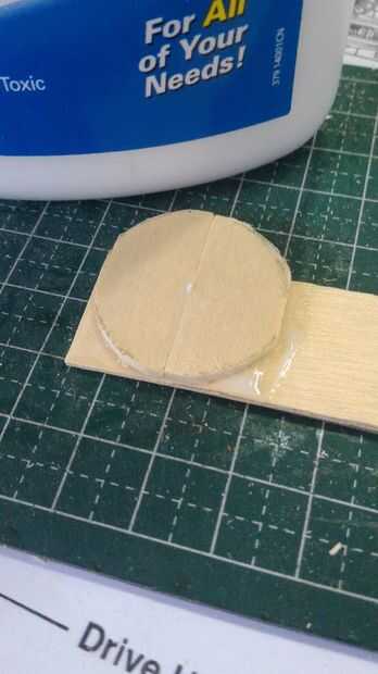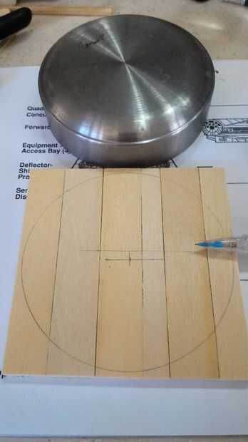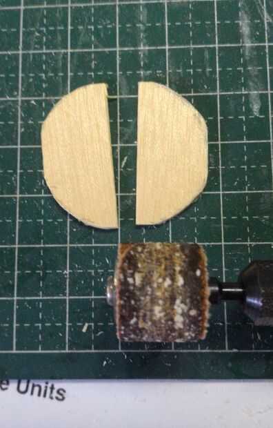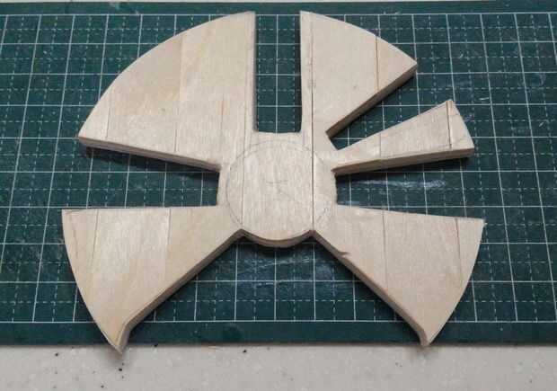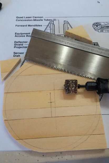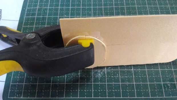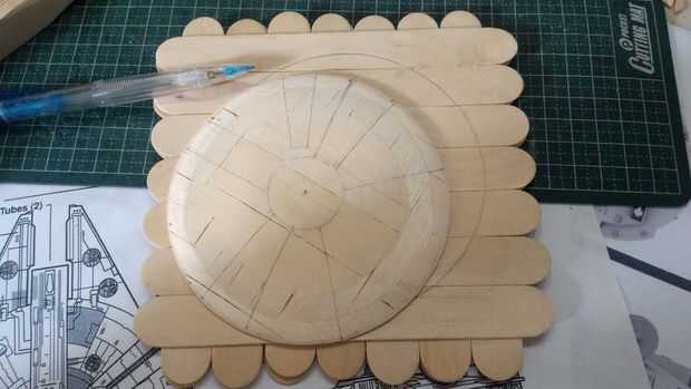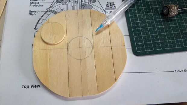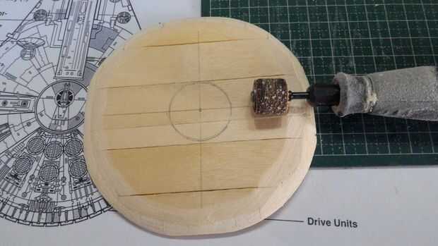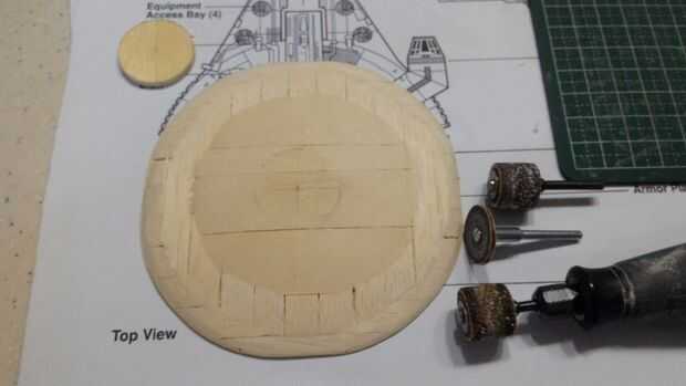 Palitos medianos de depresor de lengüeta de repuesto fueron talladas en un círculo para el top pistola blaster torreta de montaje. El Monte de la torreta redonda fue utilizado como una guía para determinar el centro del montaje de abajo del casco inferior. Finalmente, después de trazar el patrón para el pistola torreta de montaje sobre el casco de fondo redondo, el conjunto entero fue lijar utilizando un accesorio de lijadora de tambor grueso/fino de combinación en un Dremel 3000. Forma de casco inferior ahora asemejó escudo del Capitán América.