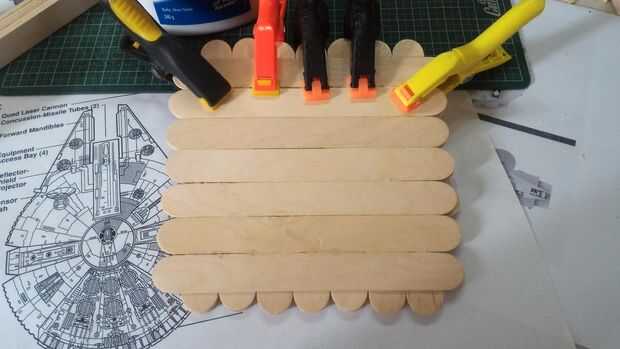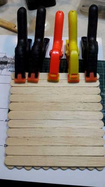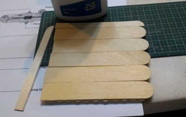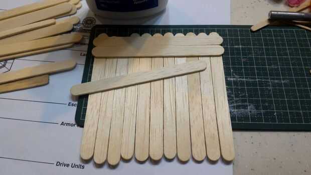 En realidad utilicé dos enfoques diferentes para el casco superior e inferior. Aunque tanto monta el consistió de 4 cuatro capas de varias combinaciones de paletas bajalengua tamaño laminado de palos y regular tamaño palitos, fui con una estructura redonda para el casco inferior de talla. Laminación de las capas de cuatro 4 consistió en pegar cada capa perpendicular a la capa anterior para reforzar toda la estructura. Una sierra de hobby fue útil en la reducción de un áspero, forma para el casco inferior redonda.