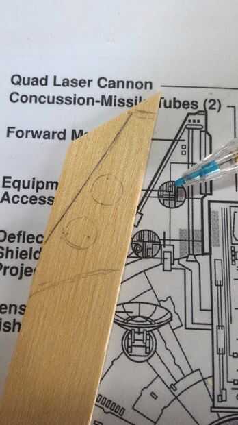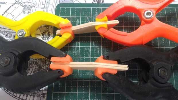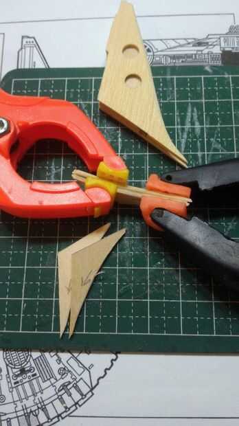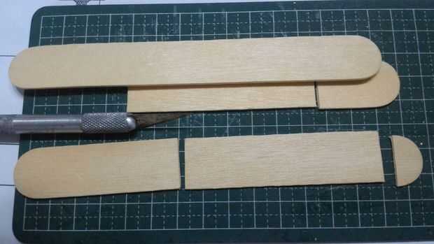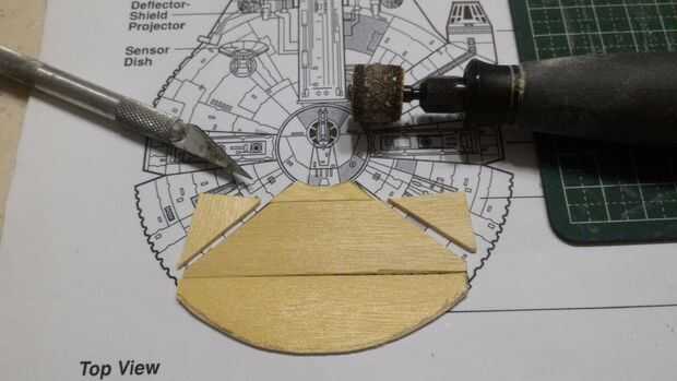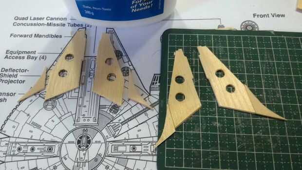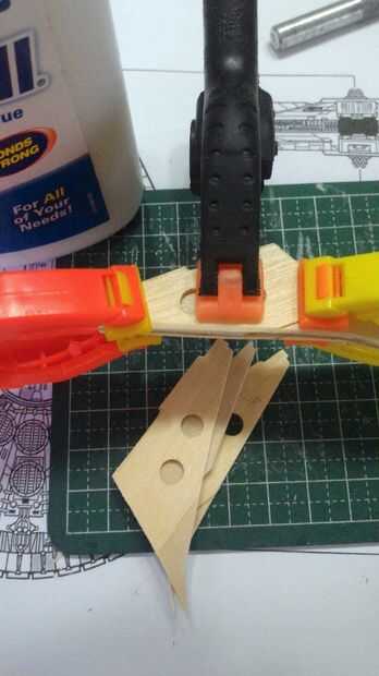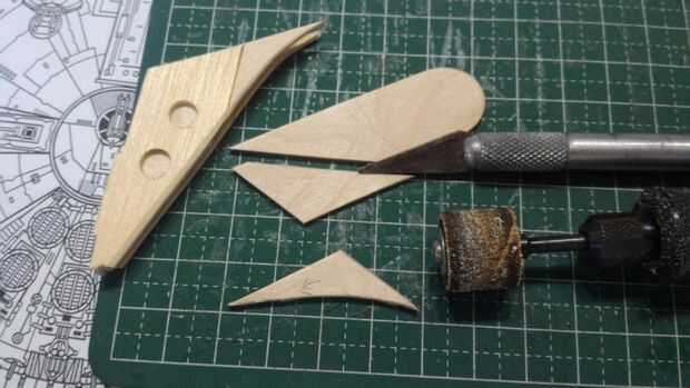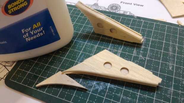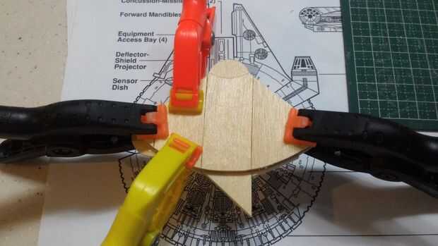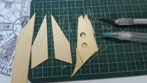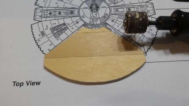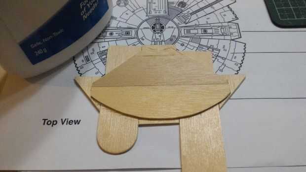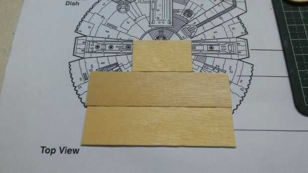 La cubierta del motor trasero superior fue hecha de 4 cuatro capas de palitos intercalado, del tamaño de depresor de lengüeta de corte y forma utilizando el patrón blueprints.com como guía. Este subconjunto será finalmente encolar el hueco en el conjunto del casco superior trasero.