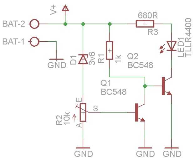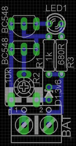 Circuito es muy simple. Contiene 3V6 Zener diodo, dos transistores multiusos, LED, dos resistencias y potenciómetro. Diseñados en Eagle PCB para caber fácilmente en el tablero de prototipo.