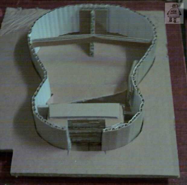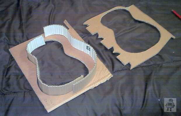 Corte dos tiras de tarjeta acanalada de pared simple de unos 47mm de ancho por más que lo suficiente para caber alrededor de una mitad del ukelele (que no es una medida exacta). Los corrugaciones que corra perpendicular a la longitud de la tira, o que no doblará bien.