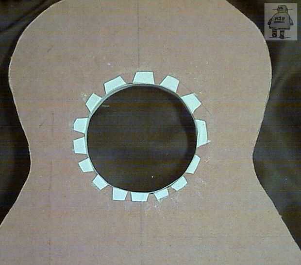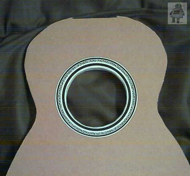 Utilizando GIMP, creó un sencillo diseño de la roseta de la boca, impreso hacia fuera y corte redondo el círculo exterior (solamente). Esto fue pegado en con Pritt stick.