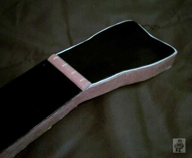 El material de acabado oscuro para la guitarra es una tarjeta negra brillante. Para el cabezal, trazada alrededor de la parte interior de las sobras de la mesa de trabajo blanco (utilizado para hacer las chapas blancas) y dentro de la línea para hacer una pieza de tamaño insuficiente. Estos estaban pegados en con Pritt stick.