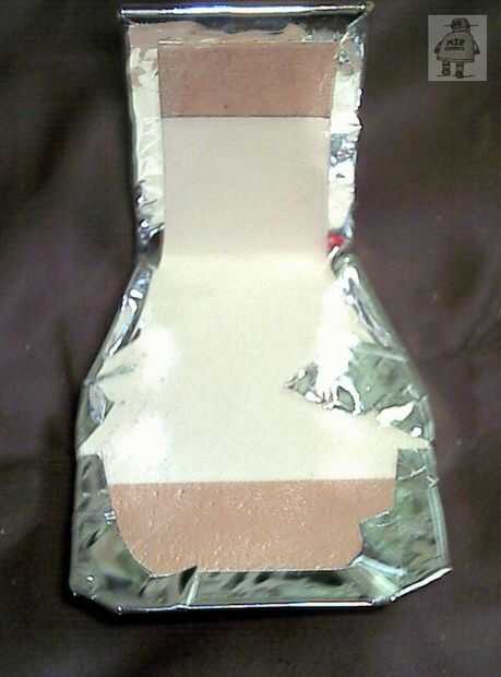 Si usted lucha para envolver regalos de Navidad, la mirada ahora. Todo fue envuelto en alguna película de mylar (hoja plateada, plástico) para darle un aspecto metálico. Hoja de plata es demasiado frágil para ello. Empecé con las tres caras más grandes, con Pritt y luego trabajó sobre los dos topes para la silla de montar, antes de cortar, doblar y pegar los lados restantes en todos los rincones. Mantener la silla en la mano para comprobar que empuja todo hacia abajo y en, no crea accidentalmente una hamaca para ella!