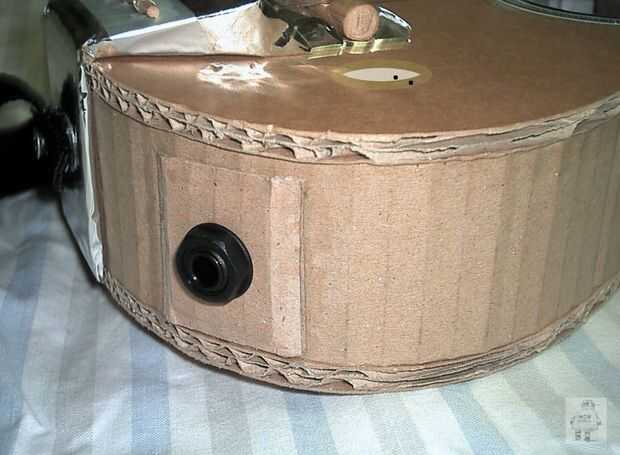 Si desea, puede añadir un pastilla piezoeléctrica. He añadido esto como una idea tardía, usted puede integrar este paso a la Asamblea principal si desea. Corté un pequeño agujero en la pared más baja que sólo tenga un jack de 1/4 mono entero "toma cuerpo y un disco piezoeléctrico de 27mm (diagonal extender una rendija para minimizar el daño).