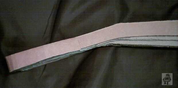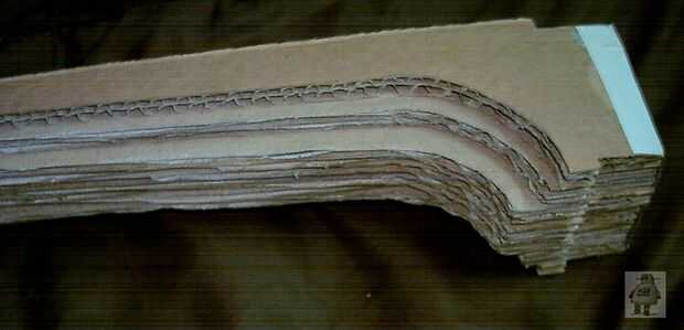 Una vez seco el pegamento, inyecta pegamento PVA en la tira protectora de ambos lados. Esto sirve dos propósitos. Que se seca duro y evitar que el cabezal que repicó. También ablanda el cartón que puede formarlo ahora. Había empujado al lado de un rollo de cinta aislante en la parte superior del cabezal, espeleología en la tarjeta y fijar allí mientras el pegamento seca. También suavemente puede aplastar abajo donde la franja de protección se encuentra con las piezas de cuello "A" para que se mezclen en forma aún más.