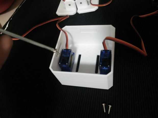 Toma los otros 2 micro servos en las ubicaciones definidas en el 3D impresión cuerpo y fijan con los tornillos con punta.