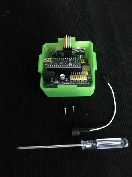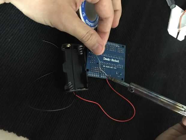 Después de poner el nano Arduino en el escudo, opcionalmente puede soldar el soporte positivo cable a Vin en el tablero y negativa a cualquier toma de tierra.