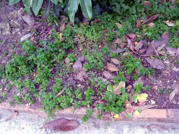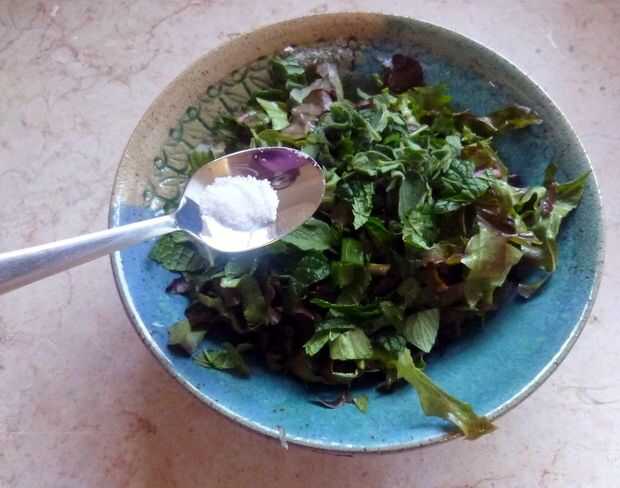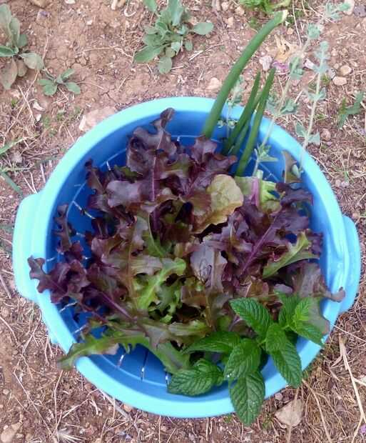 Escoger lechuga, hojas de tomillo y menta verde. y algunas pilas de cebolla.