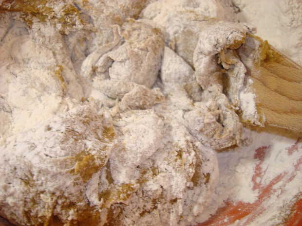 Trabajo en la harina hasta que la masa esté lisa y no pegajosa. Debe ser muy flexible y elástico.