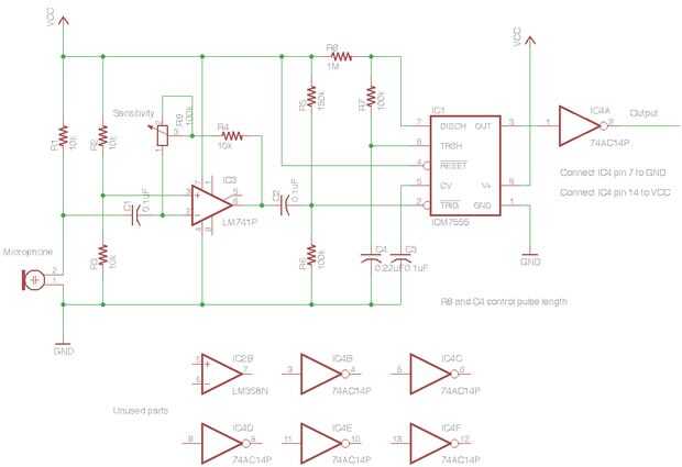 ¿Recuerdas el badajo? Eso es básicamente lo que se! Cuando el micrófono capta un ruido bastante sonido, es amplificada por el amplificador 741 operacional. Luego es enviado al temporizador 555 que está configurado como un temporizador de "paso a paso". El inversor al final formatos de pulso para el circuito de chaser. El sonido, no importa lo breve, se extendió por el temporizador a un cierto valor mínimo. En este caso, es el tiempo necesario para iluminar por lo menos dos LEDs en el circuito de chaser. El número de LEDs iluminados (el período de la onda) es determinado por la constante de tiempo RC de R8 y C4. El emisor de sonido esquemático es una versión modificada del que encontré aquí.