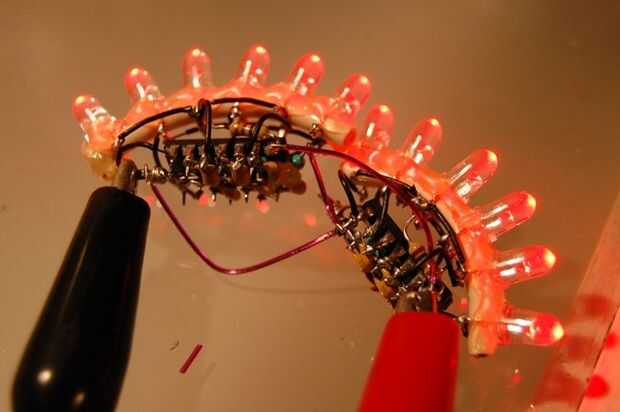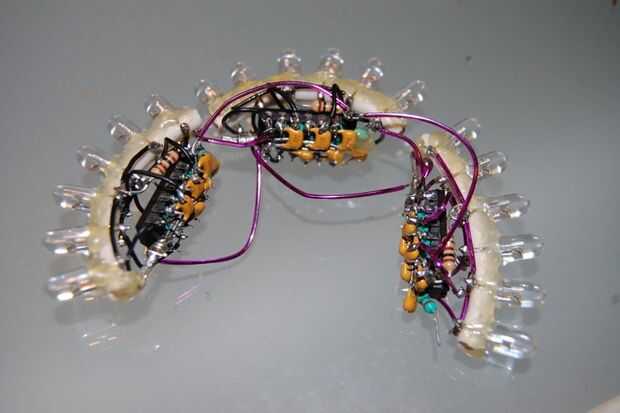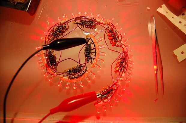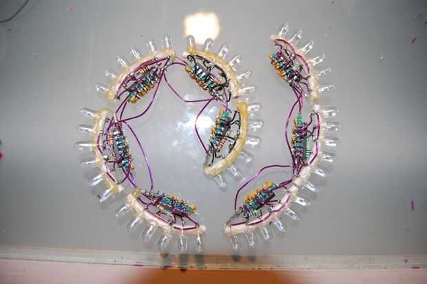 Una vez que todos los módulos están conectados, la soldadura de un solo alambre largo a la primera resistencia del primer módulo. Luego, soldar los cables en las clavijas de tierra y de la energía del último módulo en la cadena. Tenga en cuenta que si no está embalando sus módulos en un huevo, los lugares donde conectar alimentación y tierra pueden ser diferentes.