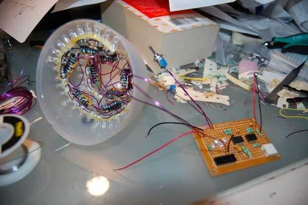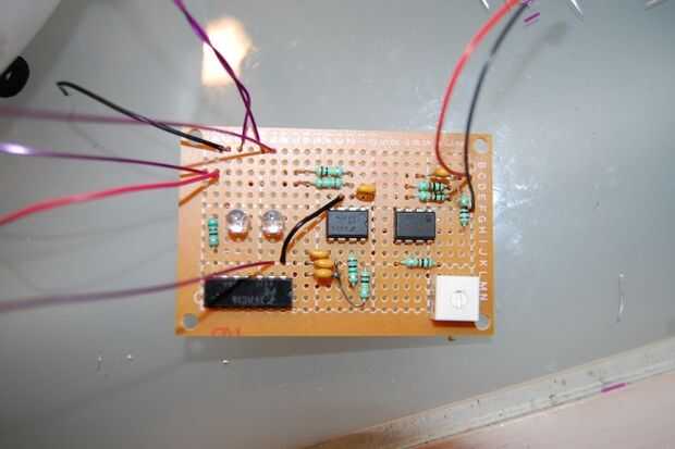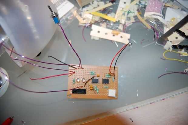 Mi cableado en este tablero fue algo casual, pero funciona. ¿La primera regla? Asegúrese de que nada se pone en cortocircuito juntos! Una vez que estés seguro de que todo está conectado como debe ser, puede seguir adelante y darle otra ejecución de prueba. Cuando usted enciende el interruptor, el RGB LED se encenderá y hacer su cosa. El chaser LEDs aleatoriamente se iluminan y empezar, um, persiguiendo. Eventualmente ellos todos apagará. Cuando usted toque el micrófono o hace algún ruido, se envía un impulso a través de la cadena.
